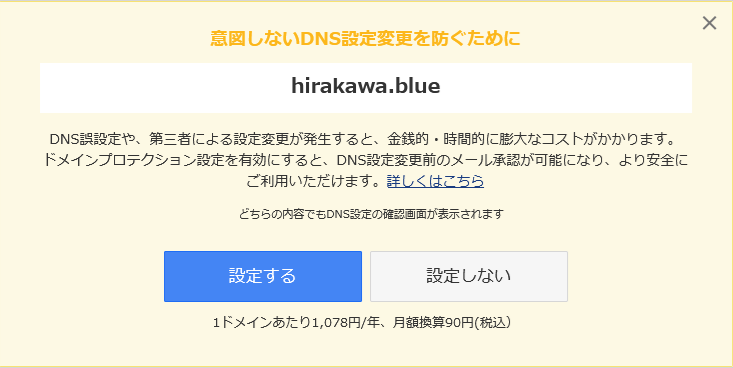 DNSの設定時に以下の画面になって、ドメインプロテクションの設定を勧めてくるんですが、これは悪質だと思いますね。